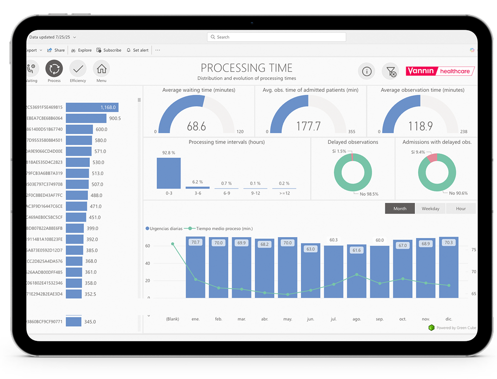 Real-time KPIs, healthcare and economic indicators, BI dashboards, and benchmark comparisons across services and centres.